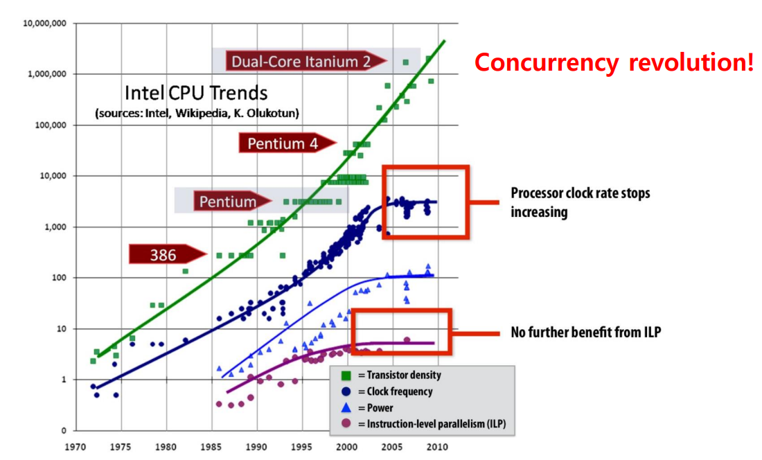 다음은 무어의 법칙인데 multicore의 등장으로 계속 트랜지스터의 집적도는 올라가나 Single thread performance는 점점 수렴하는 모습이 보여진다.